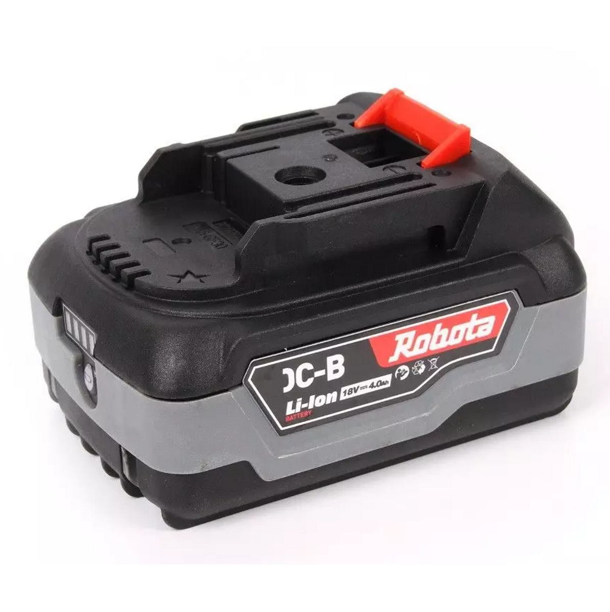 Robota Li-Ion akku Robotan 18 V akkutyökaluille. Akun varaustilan näyttö Led-valoilla.