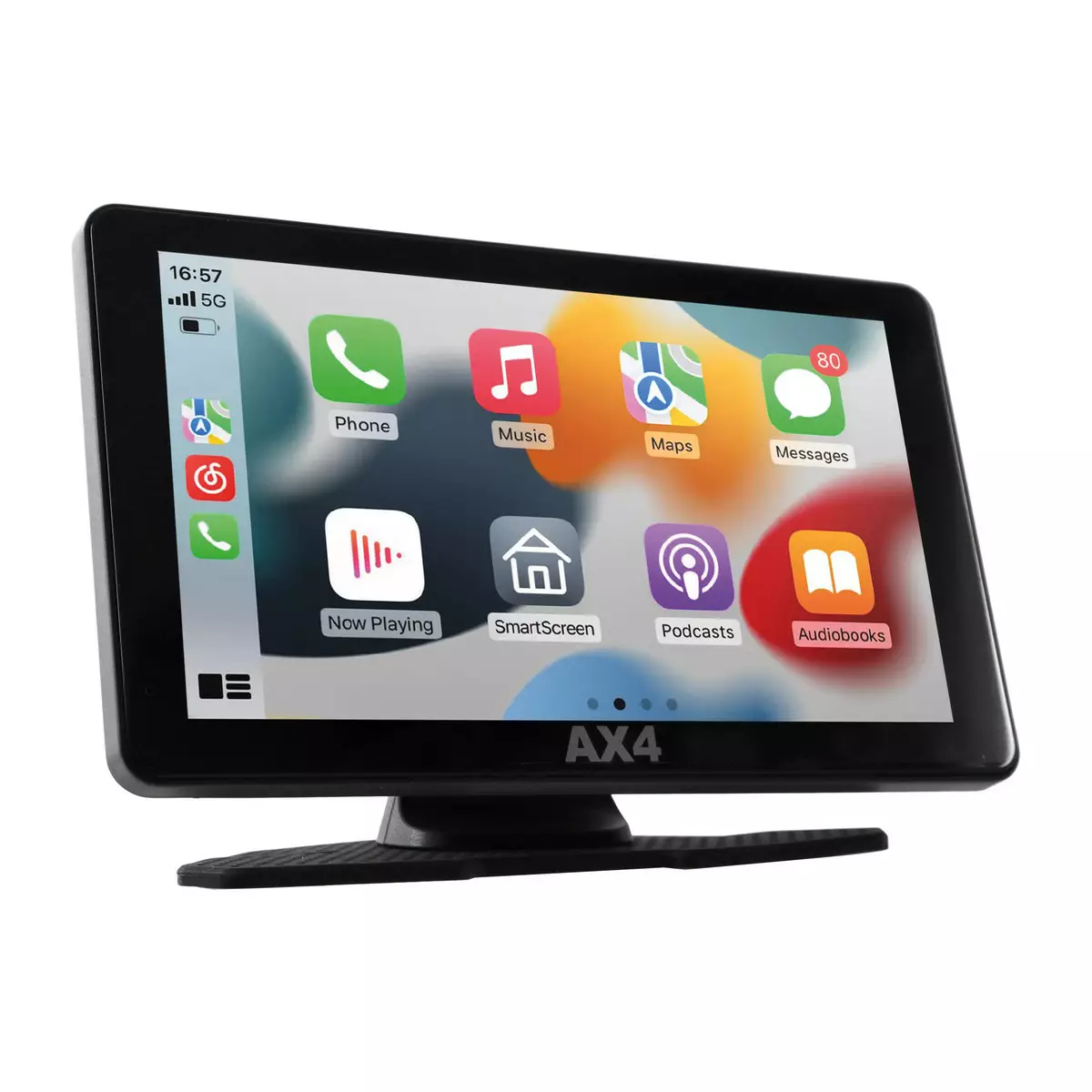 AX4 CarPlay näyttö tuo autoon selkeän kosketusnäytön ja monipuoliset toiminnot. 7 tuuman IPS-näyttö näyttää navigoinnin, musiikin ja puhelimen sovellukset selkeästi ajon aikana. Langaton Apple CarPlay ja Android Auto mahdollistavat puhelimen käytön suoraan näytöltä ilman johtoja.