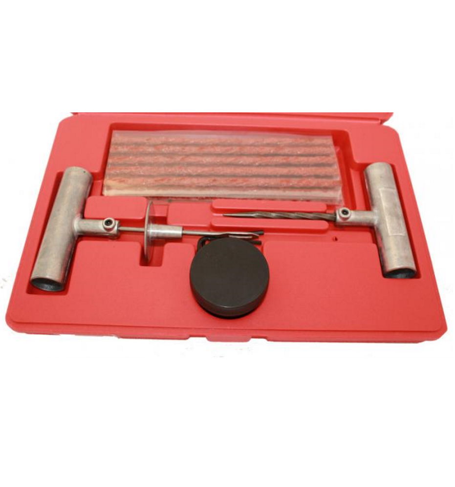 Laadukas ja kattava renkaan korjaussarja joka sisältää tukevat metalliset työkalut ja muut tarvittavat välineet pitävään paikkaukseen.