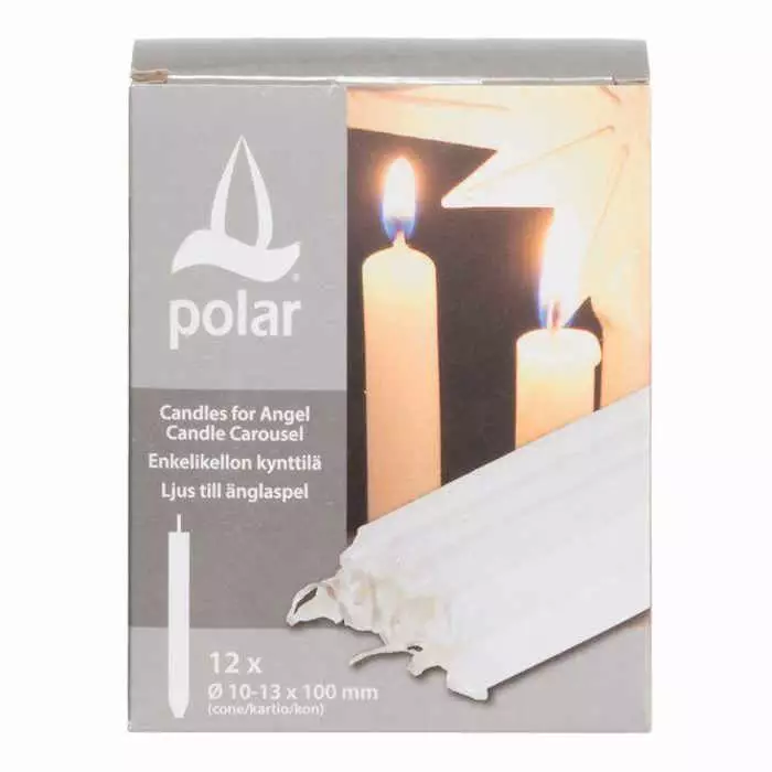 Enkelikelloon sopiva pieni kynttilä. Kynttilän halkaisija 13 mm, kynttilän alapäässä kartio 10 mm. Paloaika noin 1h.