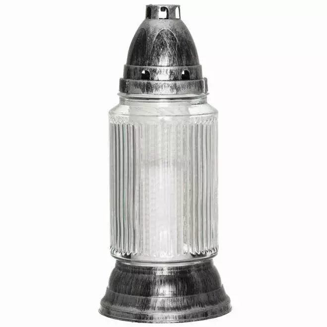 Hautakynttilässä on kauniisti vekitetty lasinen lyhtyosa. Alaosan leveys 11 cm. Paloaika noin 32 tuntia.