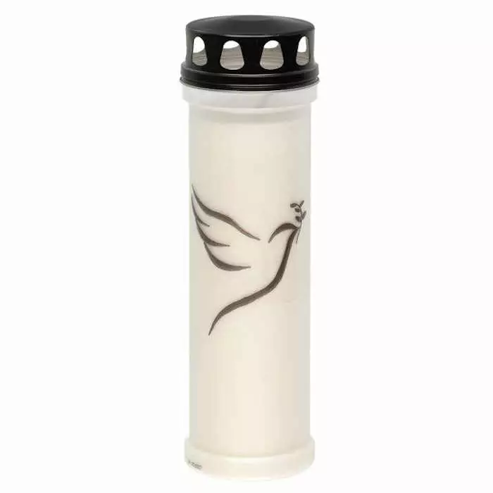 Juhla/hautakynttilä kyyhkysaiheella. Musta tuulisuoja. Paloaika noin 90h. Korkeus 24 cm.