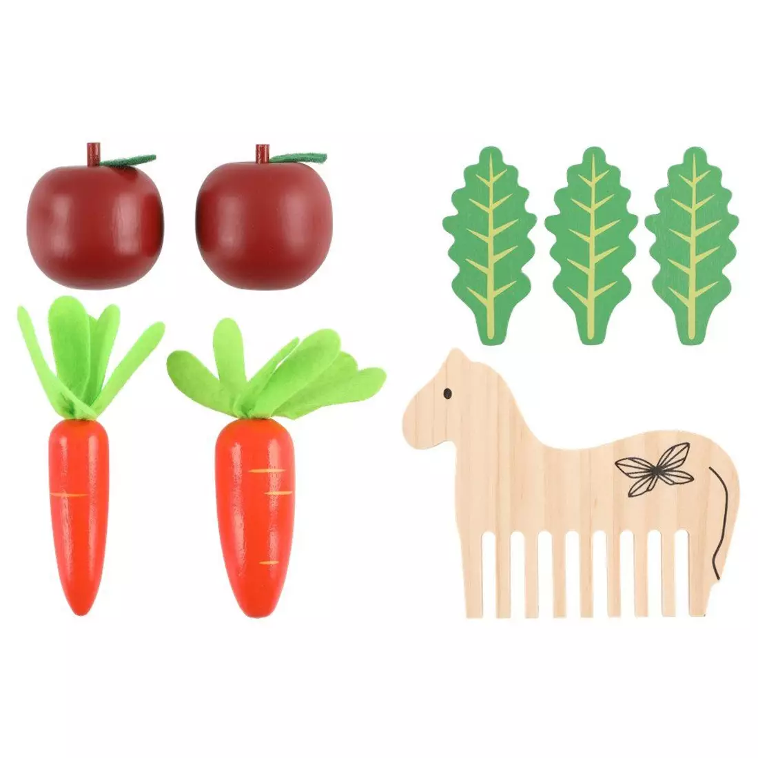 Puusta valmistetut eväät kepparille. Pakkaus sisältää 6 porkkanaa, kaksi omenaa, 3 salaattia ja suloisen hevosenmuotoisen kamman. Ikäsuositus 3+.