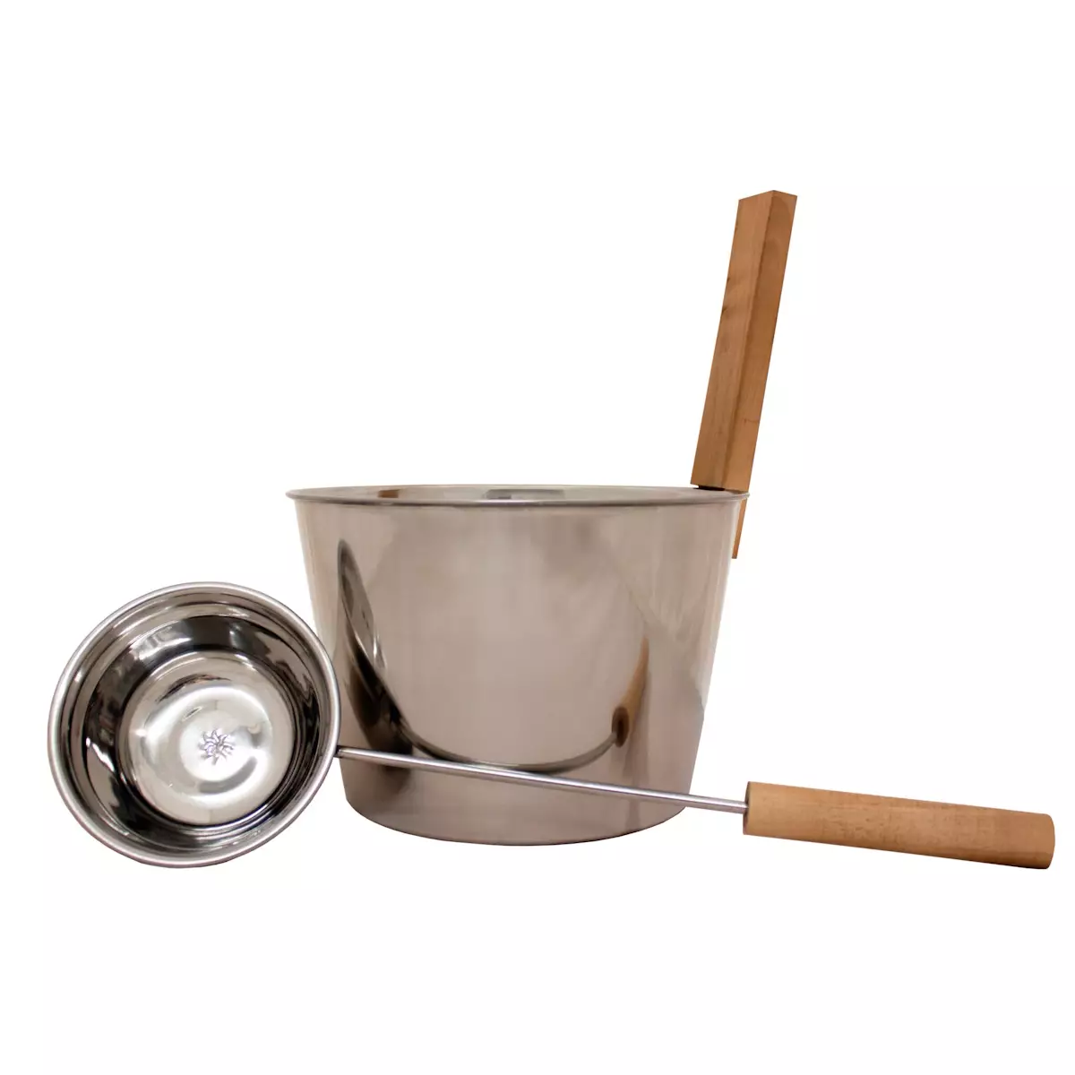 Tyylikkäässä setissä teräksinen saunakiulu ja löylykauha.