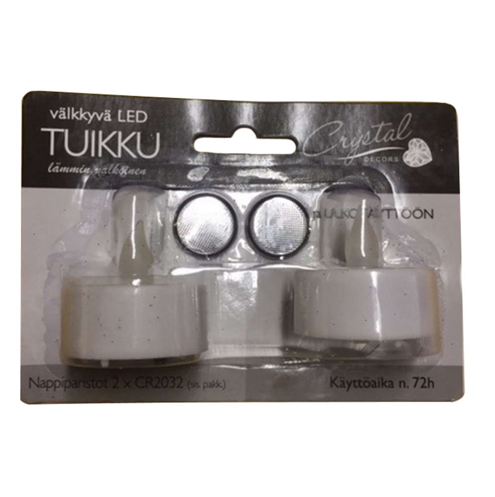 Led tuikku kynttilät 2kpl/pkt. 1xlämmin valkoinen LED, valkoinen muovikuori, tuikun koko 3,8x5cm, paristot 2x2032 sis. Pakkaukseen, ON-OFF kytkin ( ILMAN AJASTINTA )