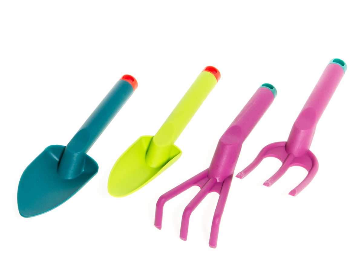 Paketti sisältää 4 erilaista pihatyökalua hauskoissa väreissä.