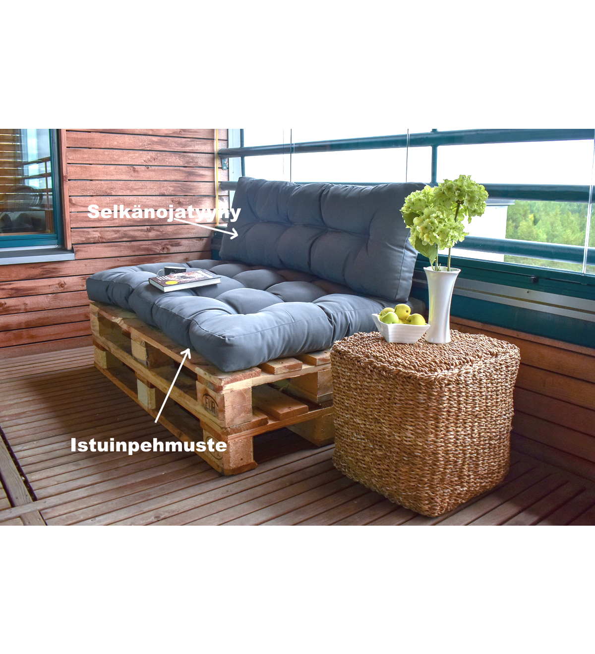 Tyylikäs pehmuste eurolavasta valmistetun huonekalun selkänojaan. Pehmusteessa on vedenpitävä kangas, joten pieni sadekkaan ei sitä haittaa. Pehmuste on helppo puhdistaa pyyhkimällä kostealla liinalla. Koristeena siinä on nappeja.