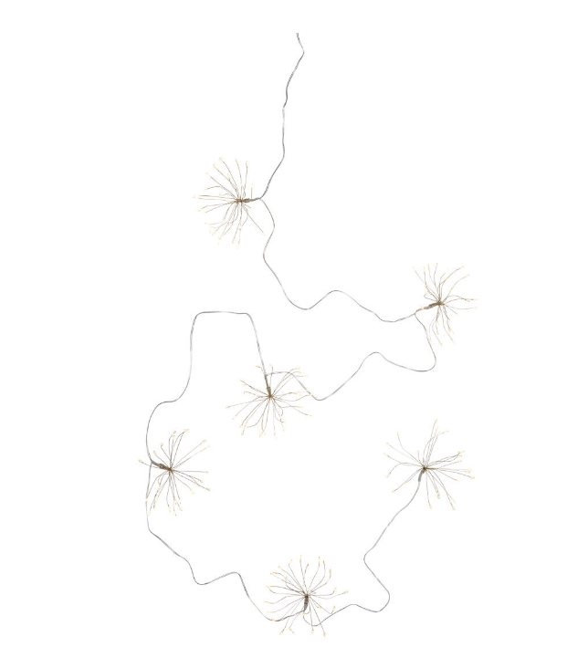 Herkkä ja kaunis kukkamainen led-valolankasarja sisustukseen tai kattaukseen. 25 lediä sirorakenteisessa ryhmässä aina 50 cm välein, valo-osuuden pituus 2,5 m. Voit taivuttaa jokaisen ledin haluamaasi muotoon erikseen. Led 150 kpl lämmin, ei vaihdettava, paloikä n. 10 000 h. Muuntaja 4,5V 2,7W IP20. Johto kirkas, liitosjohdon pituus 3 m.