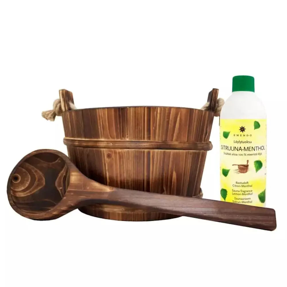 Tyylikäs poltettu puinen narukiulu ja kauha sekä Sitruuna-Menthol 500 ml löylytuoksu