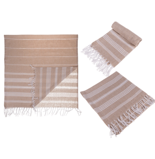 Suurikokoinen hamam pyyhe. Väri valkoinen/ruskea. 80%puuvillaa 20% polyesteriä.
