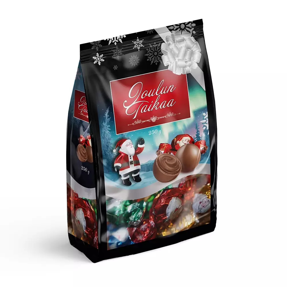 Joulun Taikaa -suklaasekoitus tuo makeaa iloa joulun hetkiin. Maitosuklaan makuiset konvehdit kätkevät sisäänsä pehmeän hasselpähkinän makuisen täytteen, joka sulaa suuhun ja luo aidon joulun tunnelman. Nämä joulumakeiset sopivat täydellisesti lahjaksi, kahvipöytään tai yhteisiin herkkuhetkiin perheen ja ystävien kanssa.
