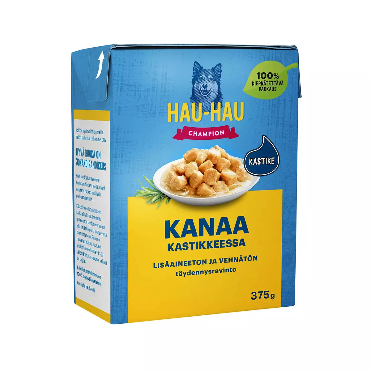 Hau-Hau Champion Kanaa kastikkeessa on lisäaineeton ja vehnätön täydennysravinto, joka tekee koiran ateriasta mehevämmän ja maistuvamman. Tuote sisältää runsaasti hyvin sulavaa kanaa ja herkullista kastiketta, joka sopii täydellisesti kuivaruokaan lisättäväksi. Täydennysravinto on valmistettu luonnollisista raaka-aineista ilman väri- ja säilöntäaineita, sokeria, vehnää tai soijaa.