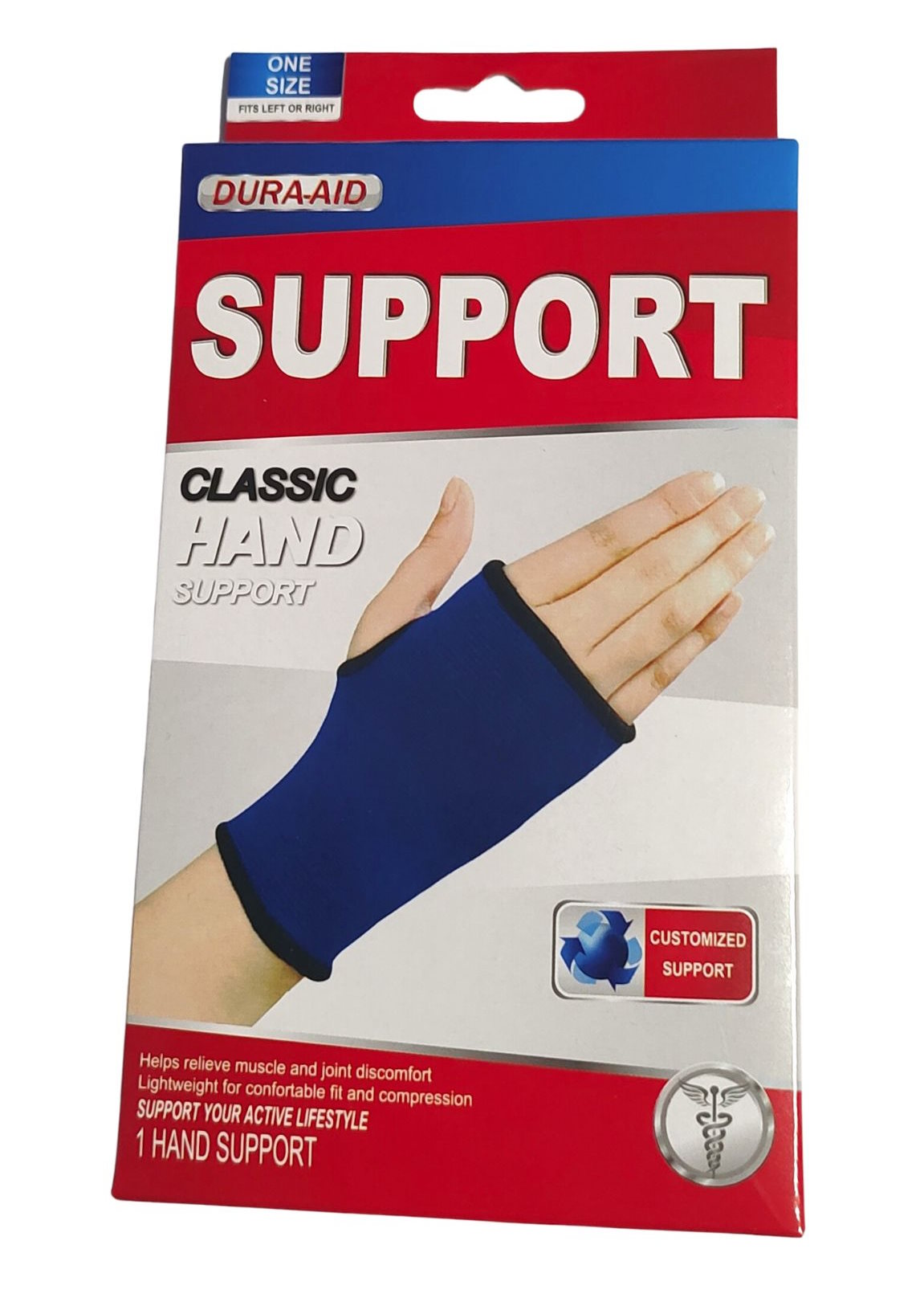 Dura-Aid käsituki helpottaa lihas- ja nivelkipuja. Tuki on mukava käyttää ja helppo pestä käsin. Valmistettu puuvillasta ja kumista. Väri sininen.