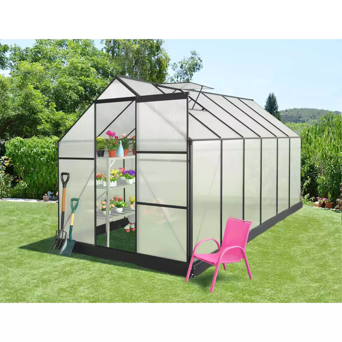 Tilava kasvihuone vihannesten, yrttien ja kukkien kasvatukseen kotipuutarhassa. Tyylikäs musta alumiinirunko ja kirkkaat polykarbonaattilevyt tarjoavat kasveille suojaisan ja valoisan kasvuympäristön. Kasvihuoneessa käytetään 4 mm UV-suojattua polykarbonaattikennoa, joka läpäisee valon mutta suojaa kasveja liialta auringonpaisteelta sekä vaihtelevilta sääolosuhteilta. Käytännöllinen liukuovi helpottaa kulkemista kasvihuoneeseen.