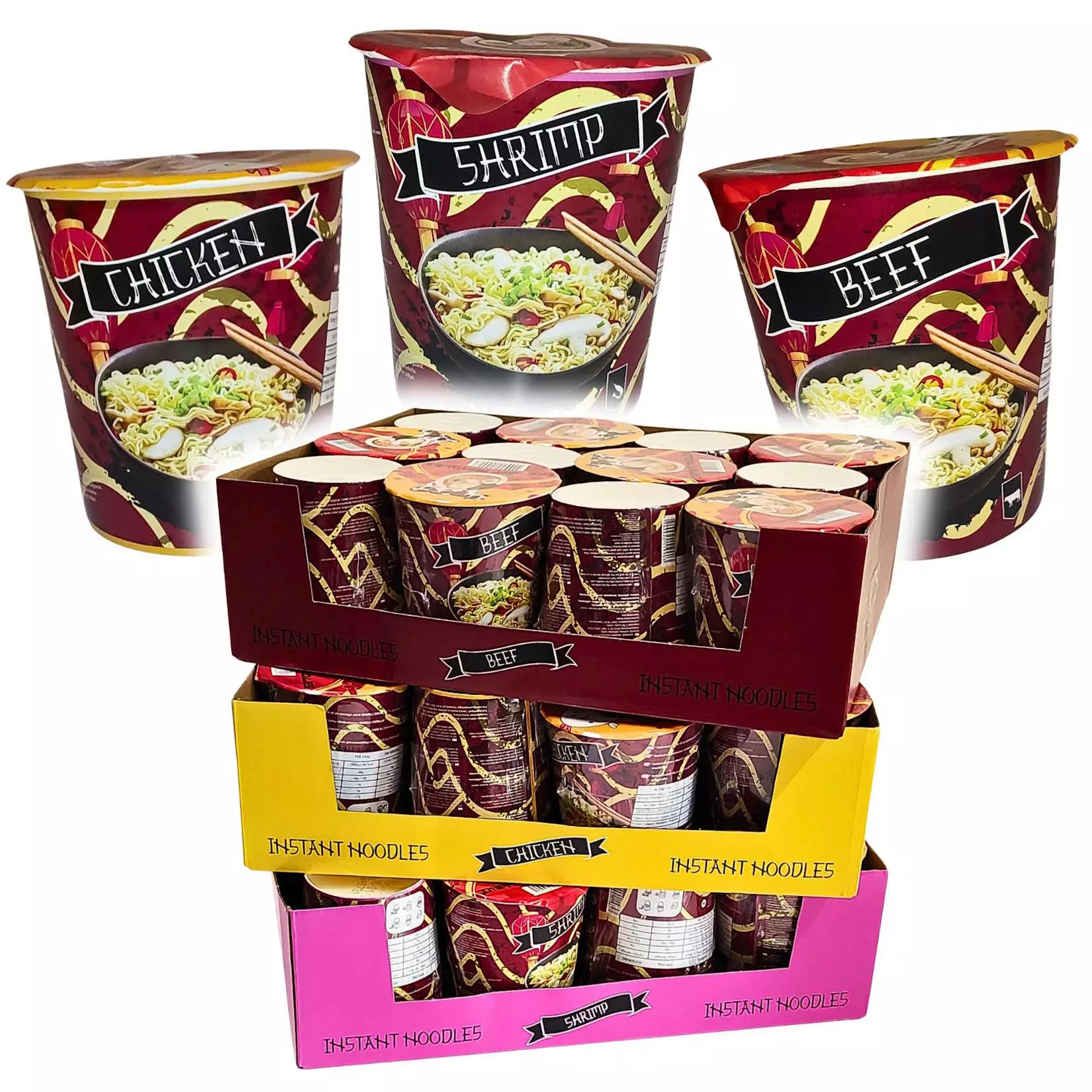 Järjestää vaikka "nuudelibileet" tai nauti itse, valinta on sinun. Edullinen jättipakkaus, joka sisältää 12 liha kuppinuudelia, 12 katkarapu kuppinuudelia ja 12 kana kuppinuudelia. Yksi kuppi painaa 65 g ja valmistuu helposti vain kuuman veden avulla. Nuudelit ovat täyttävä ja maukas vaihtoehto, joka sopii erinomaisesti silloin, kun tarvitset nopean ja helpon aterian kiireiseen arkeen. Runsas maku ja täyttävä koostumus tekevät tästä nuudelista monen suosikin.