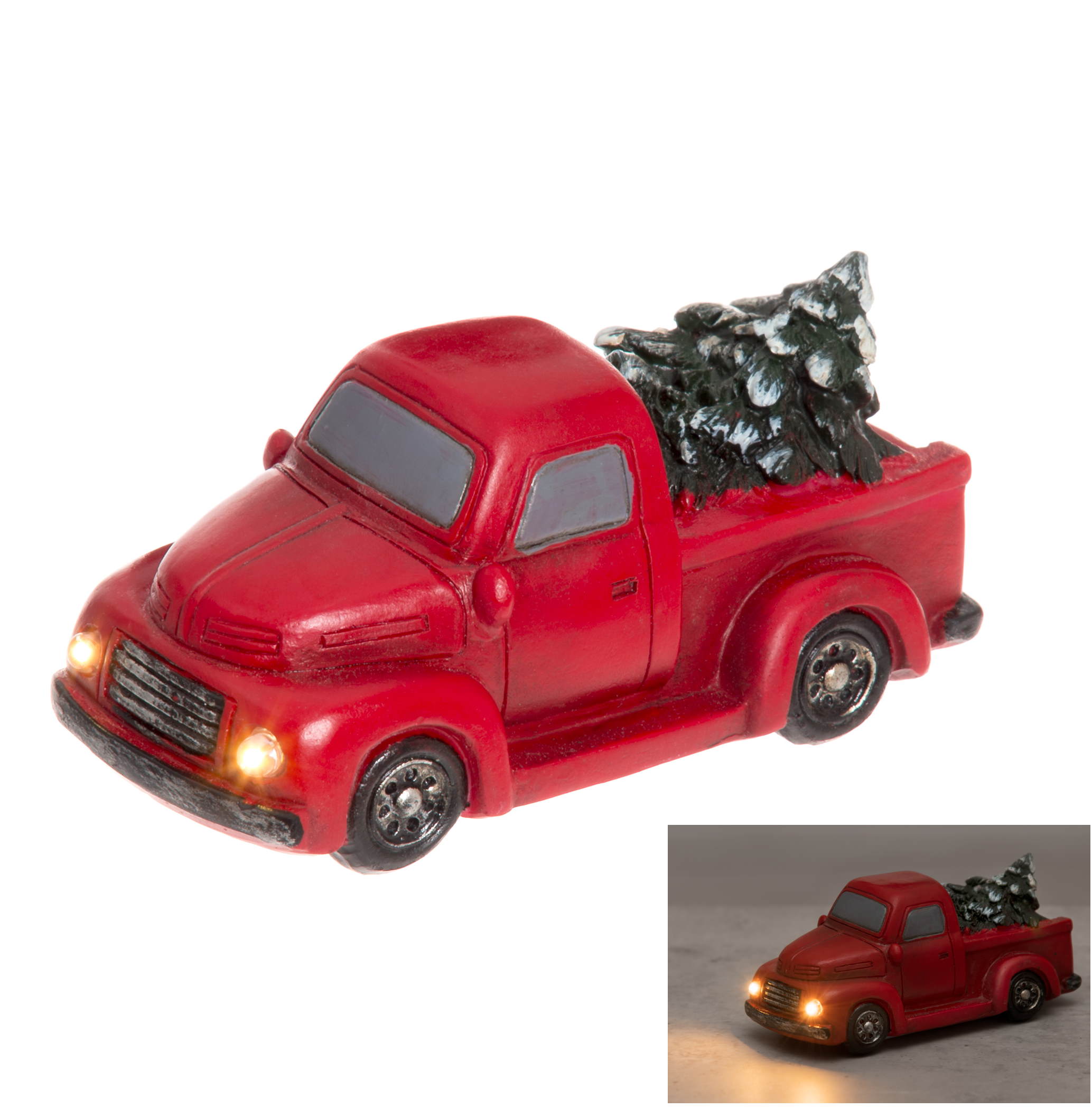 Punainen lava-auto, jossa kuusi kyydissä. Lämminvalkoinen led valo ajovaloissa. Ajastintoiminto 6h päällä, 18h pois päältä