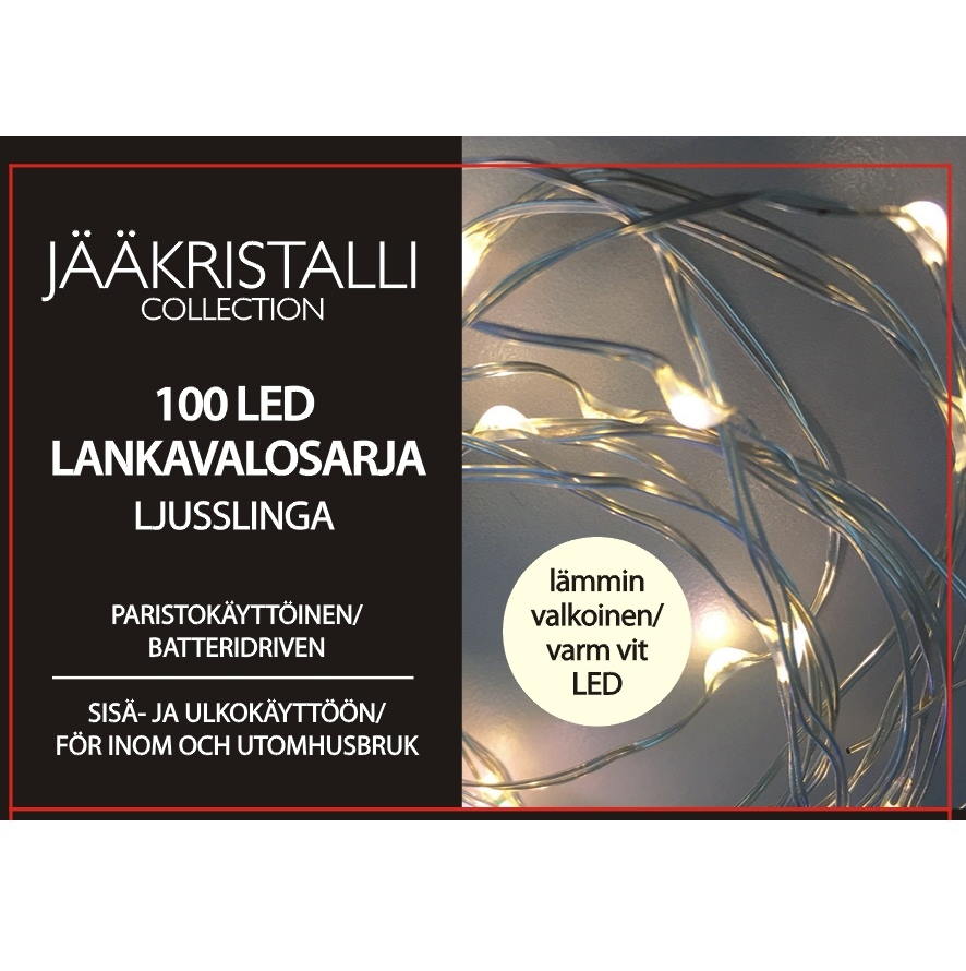Paristokäyttöinen Led Lankavalosarja 100L, LÄMMIN VALKOINEN LED, lampun väli 10cm, hopean värinen johto, kirkas liitosjohto 50 cm, IP44 paristokotelo myös ulkokäyttöön, valo-osuuden pituus 10m. Paristot 3xAA ei sis. pakkaukseen