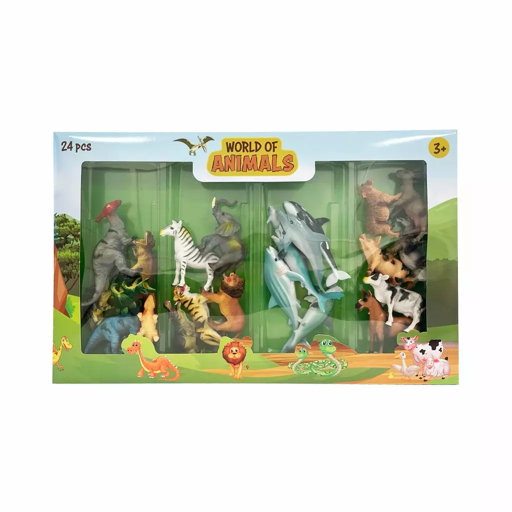 Pakkauksessa yhteensä 24 muovieläintä neljästä eri teemasta: maatilan eläimet, valtameren valtiaat, savannin asukkaat ja esihistorialliset dinosaurukset. Ikäsuositus yli 3-vuotiaille.