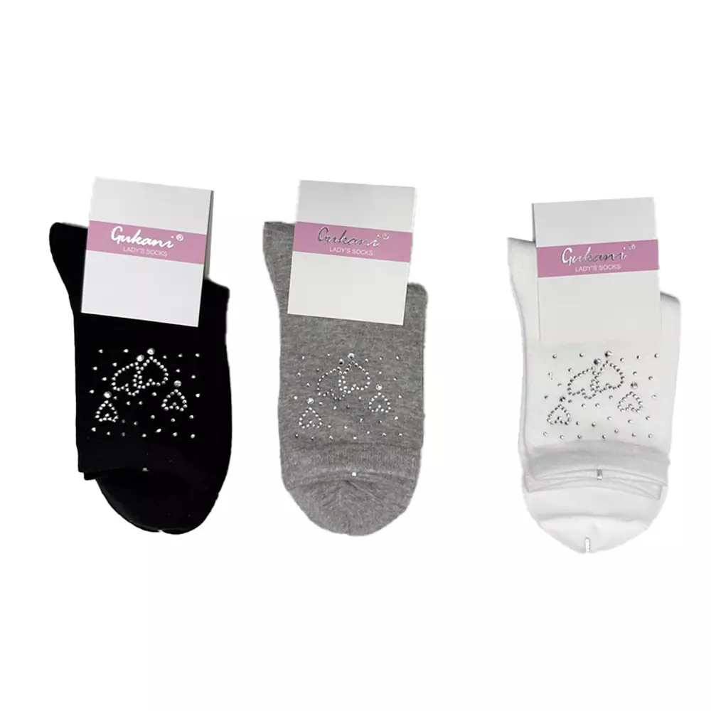 Tyylikäs nilkkasukka, jossa on kaunit sydän strassikoristeet. Ajaton ja siisti malli sopii arkeen ja juhlavampaan pukeutumiseen. Pehmeä ja joustava materiaali tekee sukista miellyttävät jalassa koko päivän ajan.