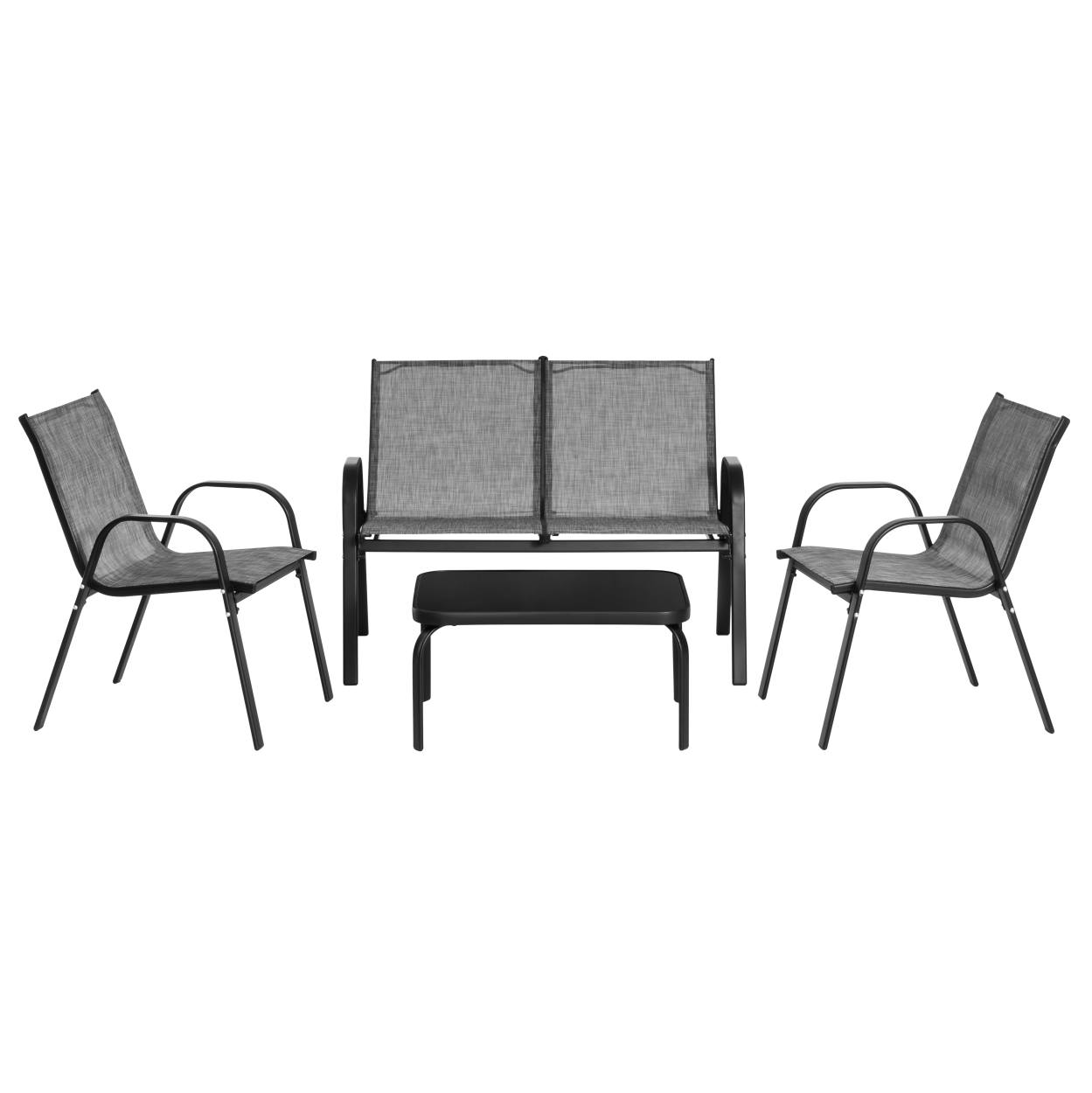 Tyylikäs ja kevyt 4-osainen oleskeluryhmä, jossa on musta teräsrunko ja kaunis harmaa textilene-verhoilu. Oleskeluryhmä sisältää kaksi tuolia, kahden istuttavan sohvan ja pöydän.