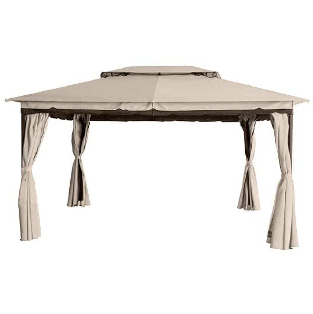 Tyylikäs ja suurikokoinen Garda-paviljonki beigen värisellä 180g/m2 kankaalla ja sivuun vedettävillä seinäkankailla sekä hyttysverkoilla on varma valinta kun tahdot käytännöllisen ja pitkäikäisen paviljongin pihaasi.