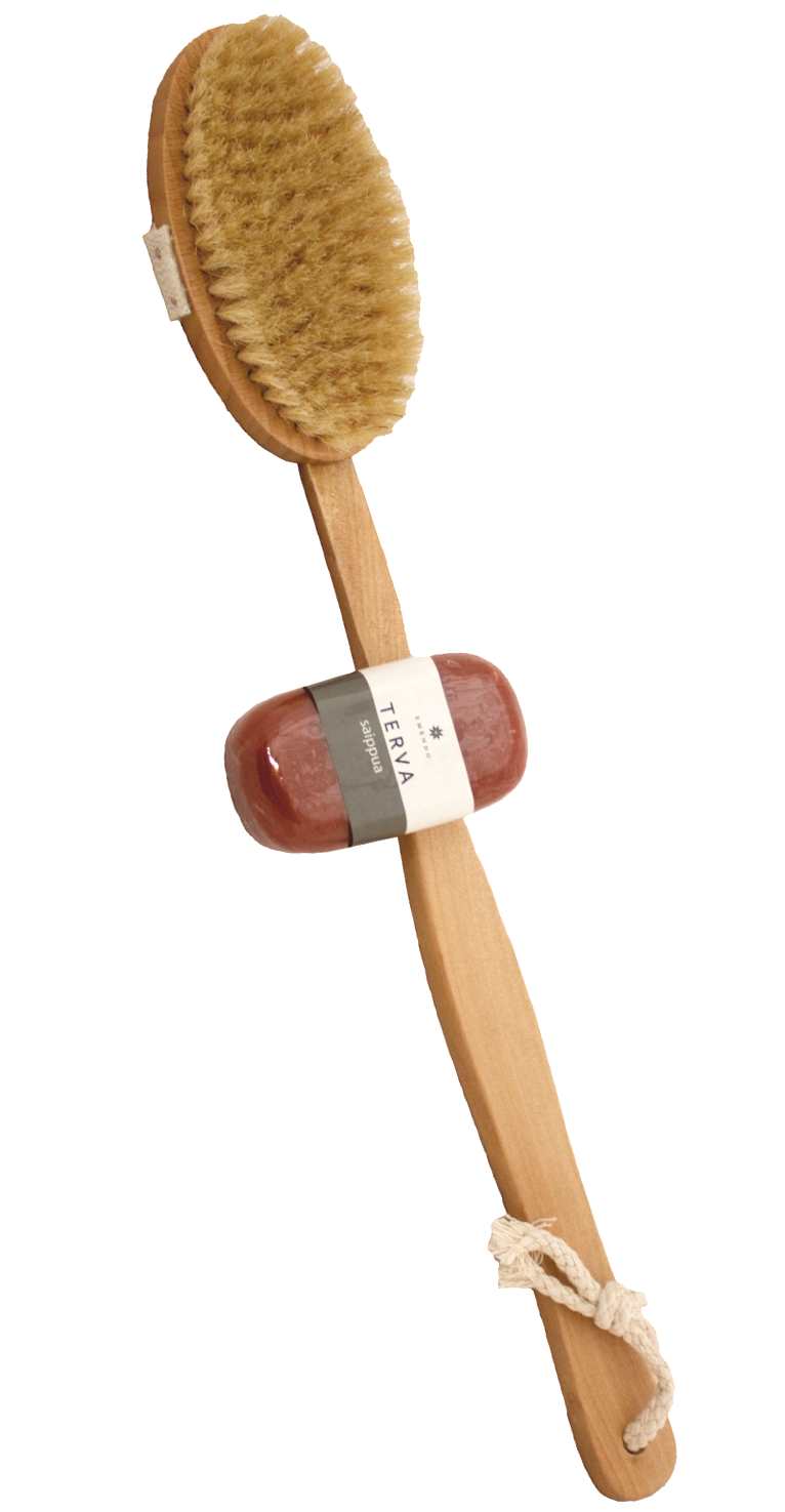 Puinen saunaharja ja Terva-saippua 100 g. Saunaharjan avulla puhdistuu selkä helposti yksinäiseltäkin saunojalta.