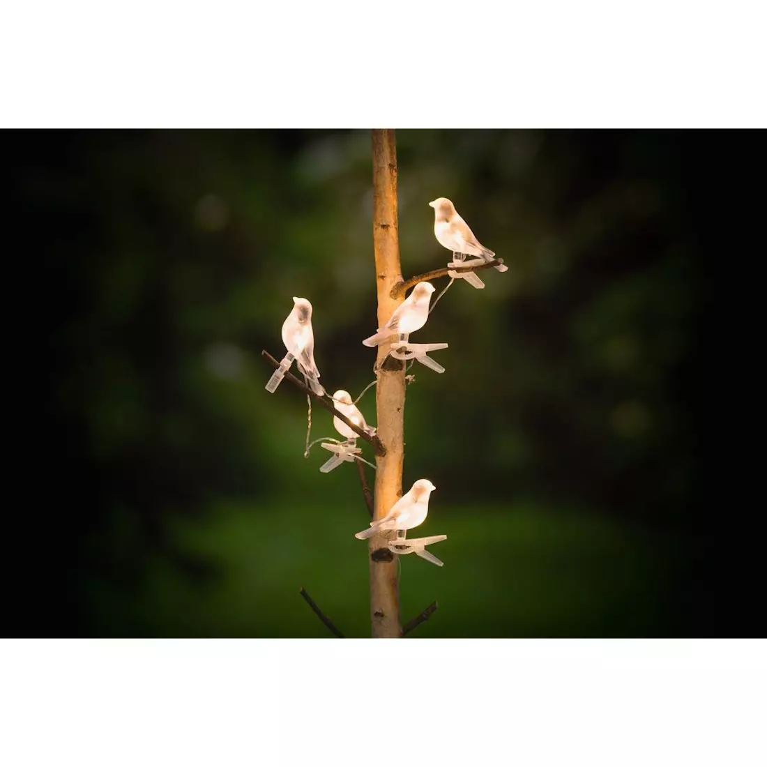Pikkulintuja valoketjussa. Hämärän tullen valo kuultaa pikkulintujen läpi. Aurinkopaneeli 8 x 4,5 cm. Aurinkopaneeli erillisessä maapiikissä. Akku 1,2V AA 600mAh Ni-MH. 5 kpl lämmin valkoinen LED. Linnun koko 13 x 3 x 5 cm. Linnun jalassa kiinnitysmekanismi. Lintujen välinen etäisyys 30 cm. Paneelin johto 2 m. Kokonaispituus 3,2 m. On/Off/vilkkuva-kytkin. Takuu 1 vuosi.