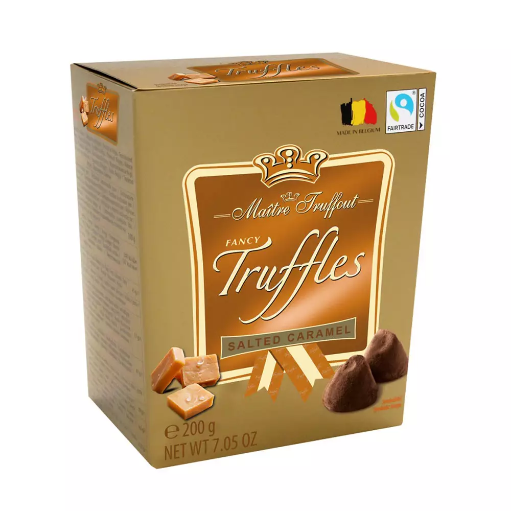 Maître Truffout Salted Caramel on belgialainen suklaatryffeli, jossa pehmeä suklaa kohtaa täyteläisen kinuskin ja hienovaraisen suolan vivahteen. Herkullinen makuyhdistelmä tekee tästä tryffelistä täydellisen nautinnon makean ja suolaisen ystäville.