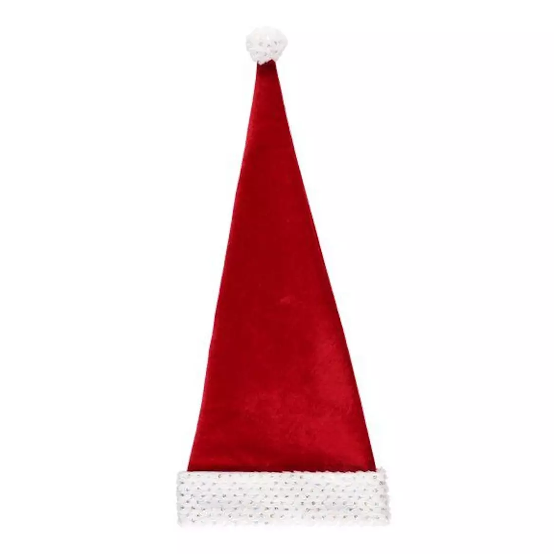 Ylellisen pehmeä pitkähiippainen lasten tonttulakki. Karvareunuksessa ja tupsussa kimaltavia koristeita. Pituus 70 cm. Ympärysmitta 61 cm.