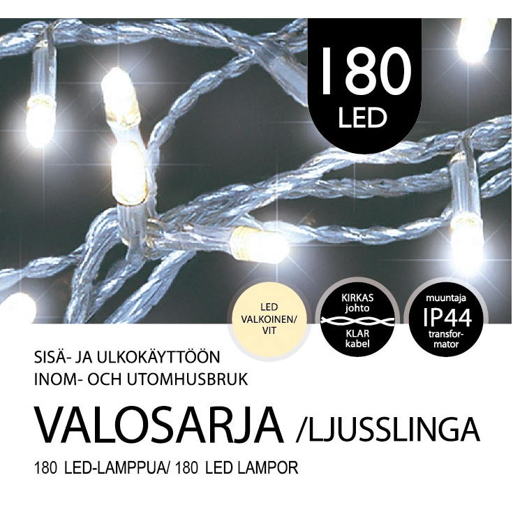 ULKOVALOSARJA LED 180Led Kylmä valkoinen IP44, kirkas johto, lampun väli 7.5cm