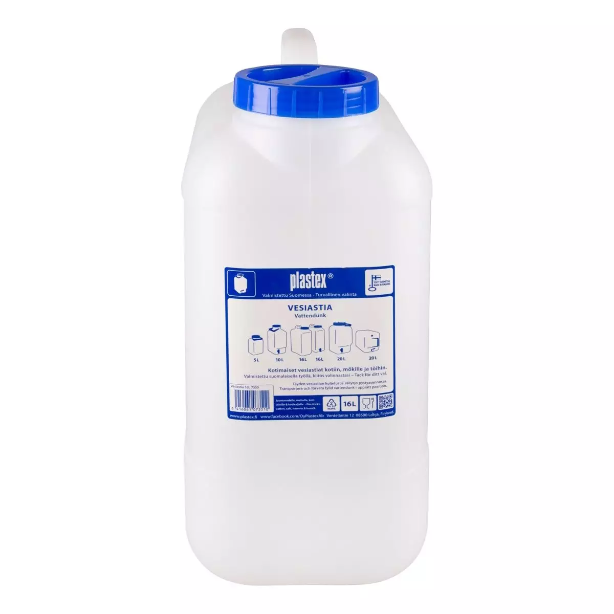 Vesiastia 16L. Elintarvikekäyttöön. Kuljetus ja säilytys pystyasennossa. BPA-vapaa. Kanisteri: PE-HD. Kansi: PP-muovia. Huuhdeltava ennen käyttöä. Valmistettu Suomessa