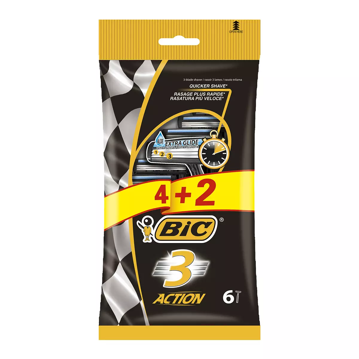 Bic 3 Action on suunniteltu nopeaan ja miellyttävään parranajoon. Varsiterässä on kolme ruostumattomasta teräksestä valmistettua terää, jotka auttavat ajamaan parran tehokkaasti ja tasaisesti. Kiinteä teräpää tukee hallittua ajoliikettä ja auttaa saavuttamaan sileän lopputuloksen päivittäisessä käytössä. Kaksi Aloe veraa sisältävää voidenauhaa parantavat terien liukua iholla ja tekevät ajosta sujuvampaa. Terät on päällystetty polymeerilla ja kromilla, mikä auttaa säilyttämään niiden terävyyden pidempään. Kaareva varsi ja pitävä uritus tukevat hyvää otetta ajon aikana.