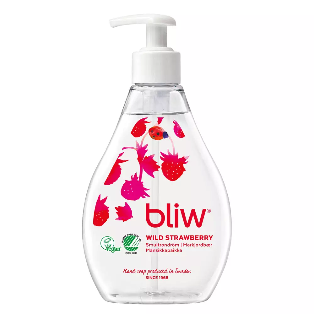 Bliw Mansikkapaikka on hyväntuoksuinen ja raikas käsisaippua. Saippua kosteuttaa ja pehmentää ihoa. Bliw saippua tuo mieleen pohjoisen luontomme ja on lempeä ympäristölle. Tuote on vegaaninen ja sille on myönnetty Joutsenmerkki. Pakkauskoko 300 ml.