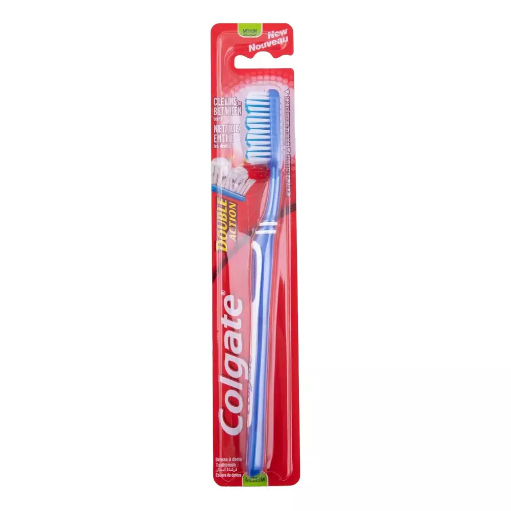 Colgate Double Action hammasharja auttaa puhdistamaan hampaat tehokkaasti ja ulottumaan myös hammasväleihin. V-muotoiset keskipitkät harjakset auttavat puhdistamaan syvemmältä hampaiden välistä, ja harjan takaosassa oleva kielenpuhdistin auttaa raikastamaan hengitystä.