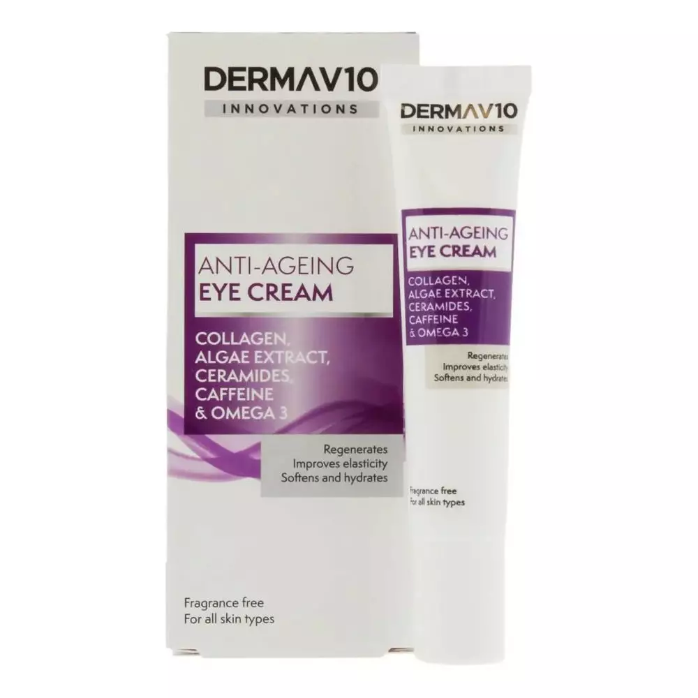 Derma V10 Anti-Ageing Eye Cream on silmänympärysvoide, joka auttaa hoitamaan ja kosteuttamaan silmänympärysaluetta. Kollageenia, leväuutetta, keramideja, kofeiinia ja omega-3-rasvahappoja sisältävä koostumus auttaa parantamaan ihon elastisuutta ja tekemään ihosta pehmeämmän ja sileämmän.