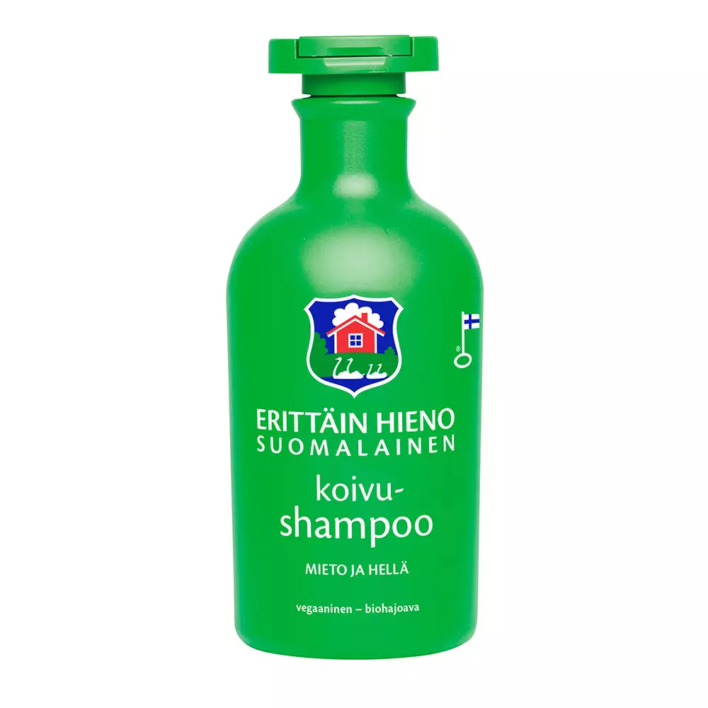Erittäin Hieno Suomalainen Koivushampoo on valmistettu puhtaista, parhaista raaka-aineista. Se sisältää luonnon omaa eliksiiriä, koivunlehdistä saatavaa koivu-uutetta. Hellävarainen koivushampoo sopii myös usein toistuvaan pesuun. Koivun raikas tuoksu tuo kesäisen saunaillan tunnelmaa arkiseen hiustenpesuun läpi vuoden. Ei sisällä silikonia. Vegaaninen ja biohajoava koostumus. Tuote on valmistettu Suomessa ja sille on myönnetty Avainlippu -tunnus. Pakkauskoko 300 ml.