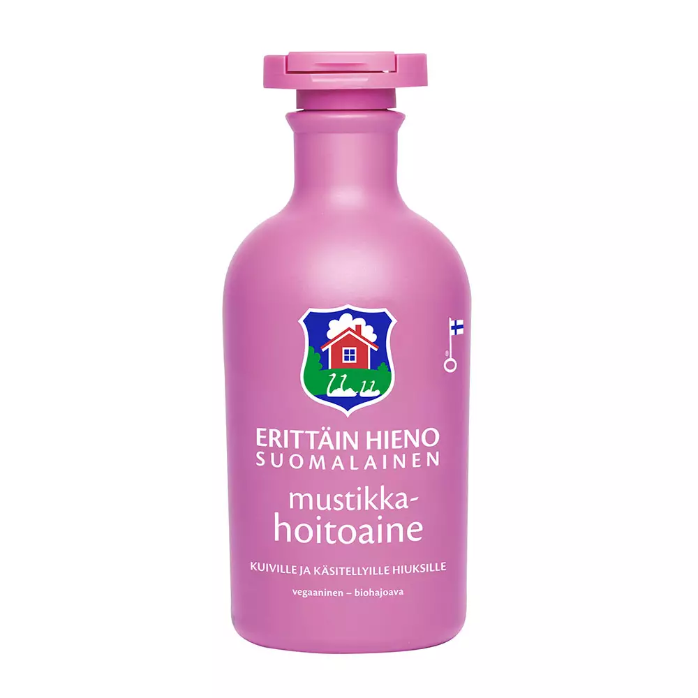Erittäin Hieno Suomalainen Mustikkahoitoaine on valmistettu puhtaista, parhaista raaka-aineista. Aitoa mustikkauutetta sisältävä hoitoaine sopii erityisesti kuiville ja käsitellyille hiuksille, kosteuttaen ja hoitaen niitä tehokkaasti. Ei sisällä silikonia. Vegaaninen ja biohajoava koostumus. Tuote on valmistettu Suomessa ja sille on myönnetty Avainlippu -tunnus. Pakkauskoko 300 ml.