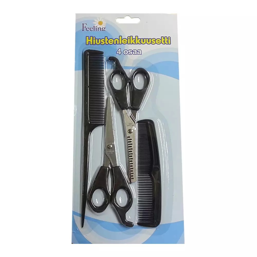 Käytännöllinen hiustenleikkuusetti kotikäyttöön. Setti sisältää perustarvikkeet hiusten leikkaamiseen ja muotoiluun, ja se sopii hyvin sekä hiusten tasoittamiseen että kevyisiin viimeistelyihin. Kompakti kokonaisuus on helppo säilyttää ja käyttää.