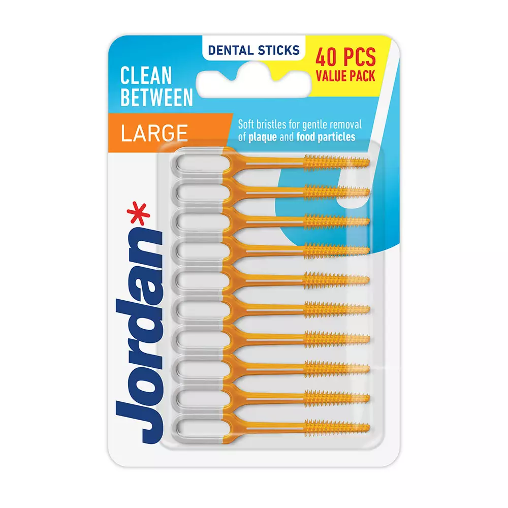Jordan Clean Between Large -hammastikku saatavana riittoisassa 40 kappaleen pakkauksessa! Jordan Clean Between –hammastikut on suunniteltu liukumaan pehmeästi hammasväleissä. Pienet kumiset harjakset hierovat ikeniä ja poistavat plakkia tehokkaasti ja hellävaraisesti, jättäen jälkeensä hyvinvoivan ja puhtaan tunteen. L-kokoiset hammastikut, sopivat parhaiten leveille hammasväleille.