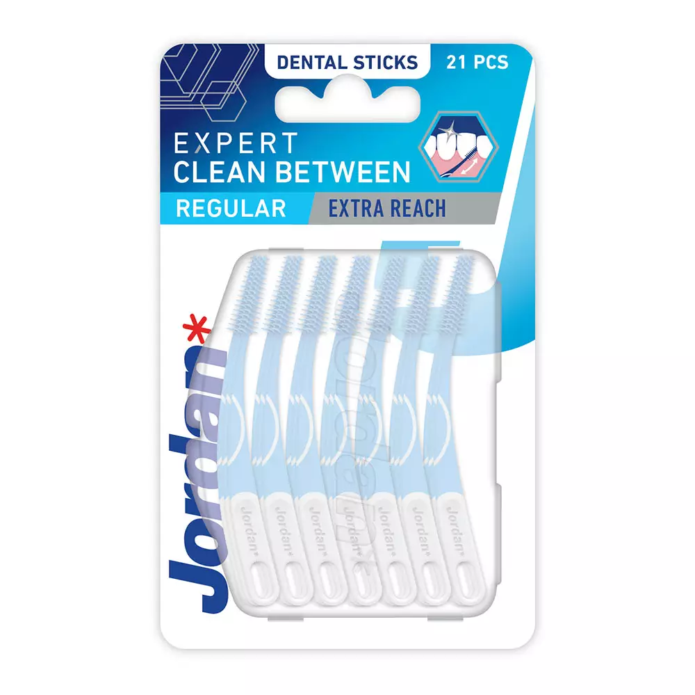 Jordan Clean Between Expert -hammasvälitikkujen kaareva muotoilu ja pitkä varsi tekevät hammasvälien puhdistamisesta helppoa ja tehokasta. Jordan Clean Between Expert –hammastikut on suunniteltu liukumaan pehmeästi hammasväleissä. Samalla kun ne poistavat ruokaa ja plakkia hammasväleistä tehokkaasti ja hellävaraisesti, pienet kumiset harjakset hierovat ikeniä ja stimuloivat verenkiertoa jättäen jälkeensä hyvinvoivan ja puhtaan tunteen. Regular - normaalin kokoiset hammastikut, sopivat parhaiten ahtaille ja normaaleille hammasväleille. Pakkaus sisältää 21 tikkua ja suojakotelon, jossa harjat on helppo ottaa mukaan.