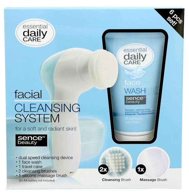 Sence Beauty kasvojenpuhdistuslaite ja kaikille ihotyypeille soveltuva pesuaine. Sisältää kaksi puhdistavaa harjaosaa ja yhden hierontapään.