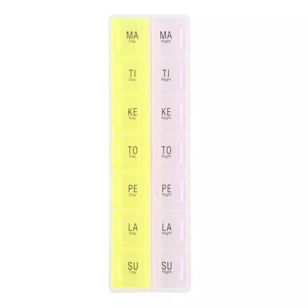 Kätevän kokoinen lääkeannostelija viikon ilta- ja aamu lääketarpeeseen. Erinomainen esimerkiksi matkoilla. Helppo täyttää ja käyttää. Koko 22 x 6 x 2cm.