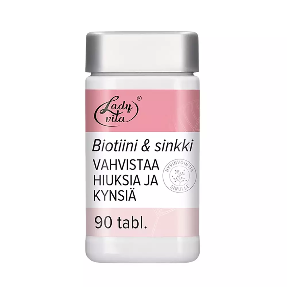 Ladyvita Hiukset & kynnet on ravintolisä, joka sisältää hiuksia ja kynsiä vahvistavia ravintoaineita: Biotiini ja sinkki edistävät hiusten pysymistä normaaleina ja sinkki myös kynsien pysymistä normaaleina. Kupari tukee hiusten normaalia pigmentoitumista. Tabletti on mantelinmuotoinen, minkä vuoksi tabletti on helpompi niellä kuin pyöreä tabletti. Tablettimuoto on kliinisesti testattu. Ravintolisä ei korvaa monipuolista ja tasapainoista ruokavaliota eikä terveitä elämäntapoja. Purkki on valmistettu osittain kierrätysmuovista.