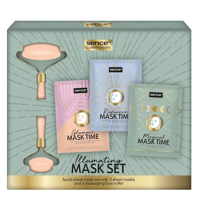Sence lahjapakkaus kasvojen hoitoon. SIsältää kolme ihoa hellivää kasvomaskia ja ylellisen rollerin. Vegaaninen koostumus. FSC-merkki.