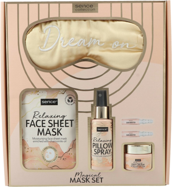 Lahjapakkaus sisältää silmämaskin, rentouttavan kasvomaskin, tyynysuihkeen ja päivävoiteen sekä skin boosterin.