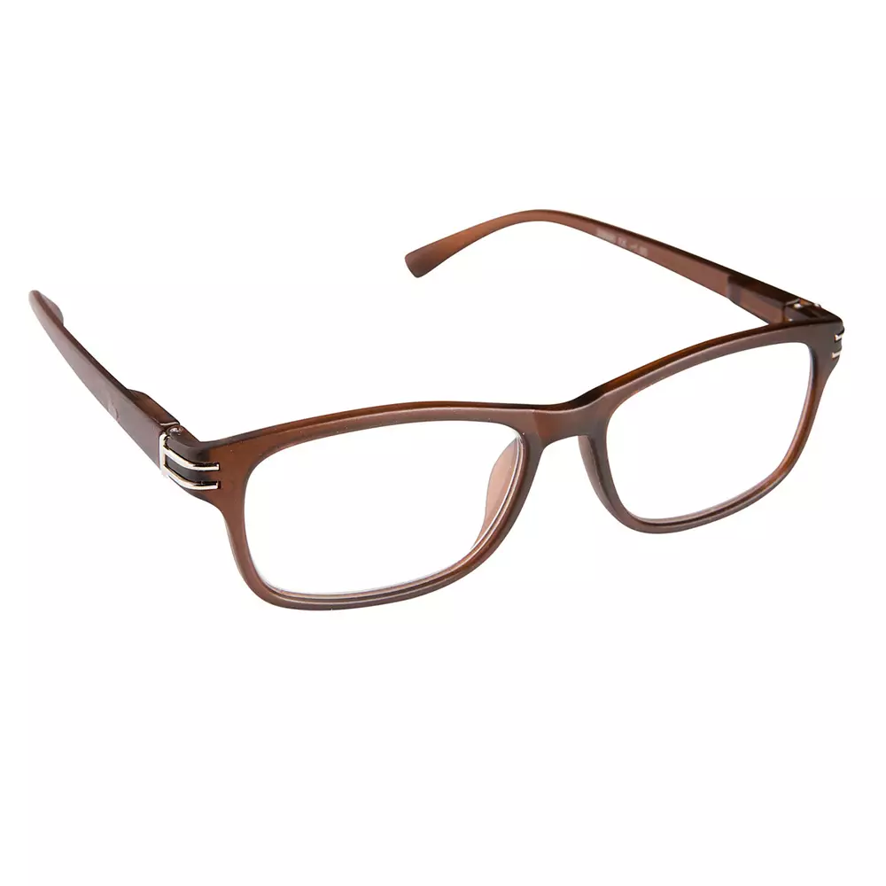 Ajaton lukulasimalli miehille. Väri: Mattaruskea, hieman läpikuultava, kehyksen reunoissa hopeiset yksityiskohdat. Vahvuus +2.00. Muovikehys. Turvallinen, suurentava apuväline ikänäköön.