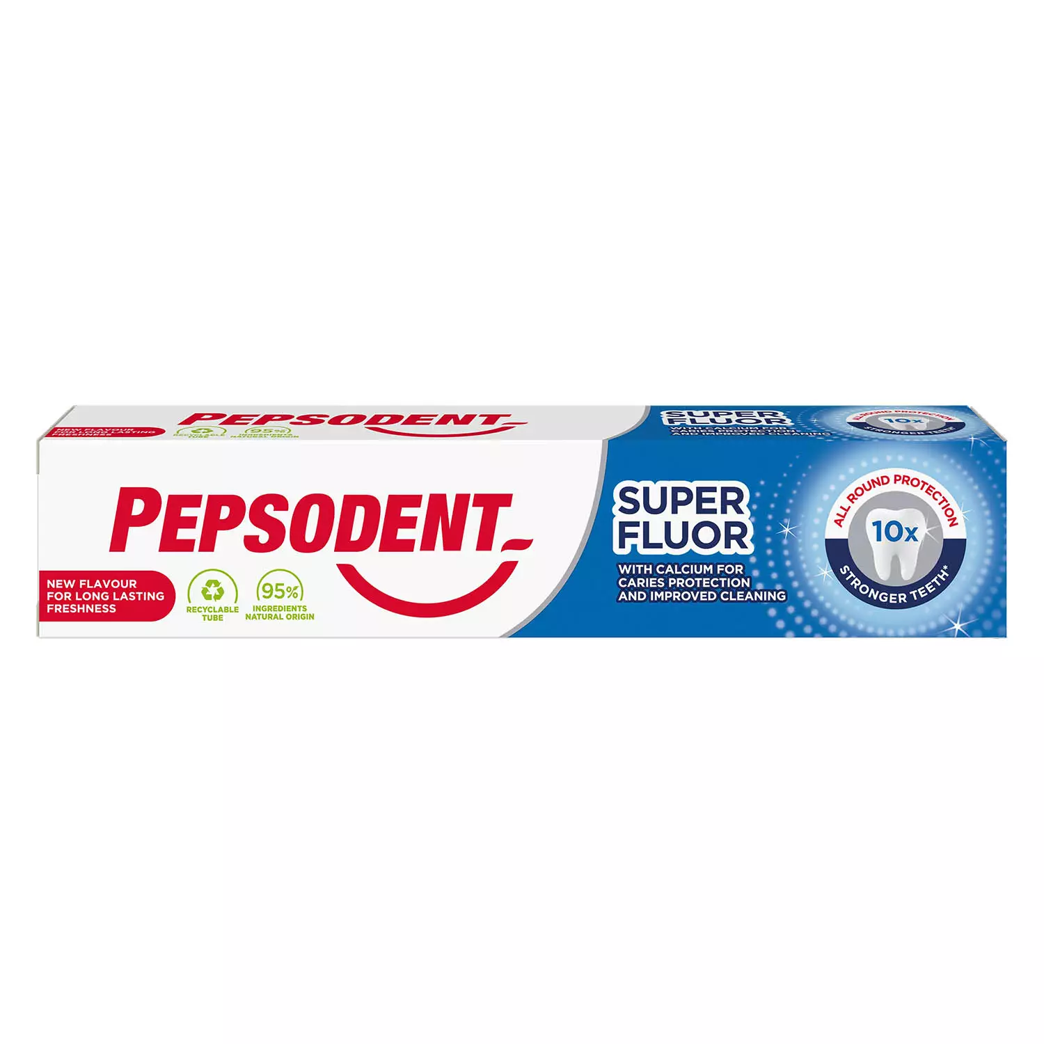 Pepsodent Super Fluor on raikas ja miedonmakuinen perushammastahna koko perheelle. Pepsodent Super Fluor -hammastahna vähentää happohyökkäyksen hampaiden kiillettä liuottavaa vaikutusta ja ehkäisee kariesta. Pepsodent Super Fluor raikastaa suun samalla kun hampaat puhdistuvat perusteellisesti: tuloksena on raikas hengitys koko perheelle ja vähemmän reikiä hampaissa. Pepsodent Super Fluor vahvistaa hampaidesi kiillettä ja sisältää suositellun määrän fluoria, 1450 ppm.