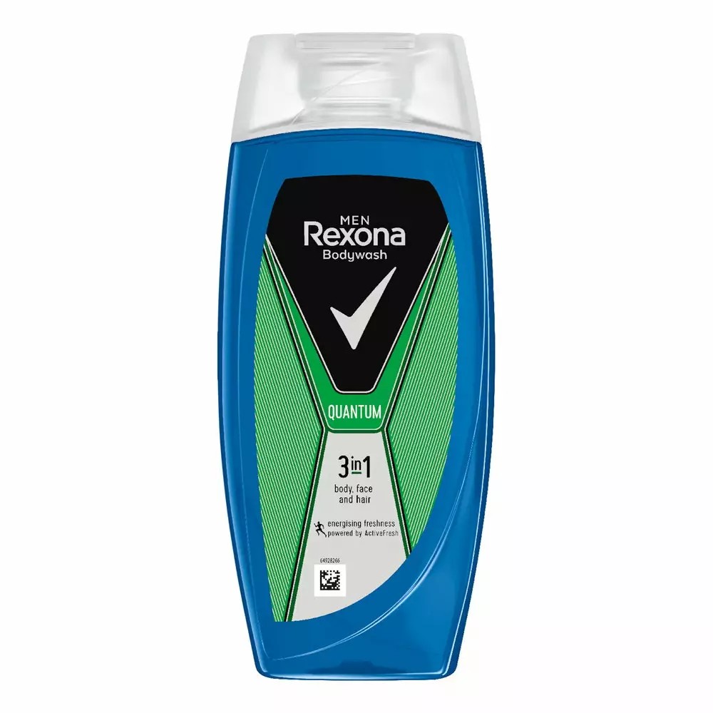 Rexona Men Quantum 3 in 1 on virkistävä suihkusaippua miehille, joka sopii sekä vartalon että hiusten pesuun. Kätevä 3 in 1 koostumus toimii suihkugeelinä ja shampoona, joten hiukset ja vartalo voi pestä samalla tuotteella. Energisessä tuoksussa on metsäisiä sävyjä, ripaus myskiä sekä raikkaita sitrushedelmiä, jotka jättävät iholle puhtaan ja raikkaan tunteen.