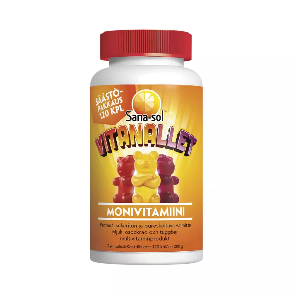 Sana-sol Vitanallet Monivitamiini on hyvänmakuinen päivittäinen vitamiinilisä pehmeässä ja pureskeltavassa muodossa. Vitanallet Monivitamiini sisältää yhdeksän vitamiinia. Säästöpakkaus 120 kpl. Pakkauksessa kolme koostumukseltaan samaa, mutta maultaan erilaista Vitanallea. Mukana ovat vadelman, appelsiinin ja mustikan makuiset Vitanallet. Sokeriton. Sana-sol Vitanallet tekee vitamiinien ottamisesta hauskaa!