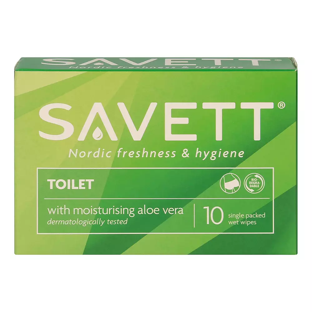 Savett Toilet on kosteuttava ja rauhoittava, Aloe Veraa sisältävä kosteuspyyhe ihon puhdistukseen WC-käyntien yhteydessä. Erittäin pehmeä kosteuspyyhe antaa raikkaan tunteen. Se puhdistaa hellävaraisesti ja auttaa pitämään ihon pehmeänä. Savett Toilet on hajusteeton ja siinä on sama pH-arvo kuin iholla. Yksittäispakatut pyyhkeet on helppo ottaa mukaan. Kosteuspyyhe on biologisesti hajoava. Älä heitä kosteuspyyhettä WC-pönttöön. Valmistettu Suomessa. Dermatologisesti testattu. Sisältää 10 yksittäispakattua kosteuspyyhettä.